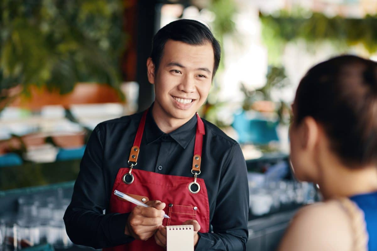 Cheerful Vietnamese waiter talking to restaurant guest